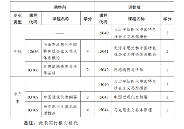 (一)专科专业。思想政治理论课设置由原来2门调整为3门,共 9 学分,包括“习近平新时代中国特色社会主义思想概论”(课程代码15040,3学分)、“毛泽东思想和中国特色社会主义理论体系概论”(课程代码15041,3学分)和“思想道德与法治” (课程代码15042,3学分)。
